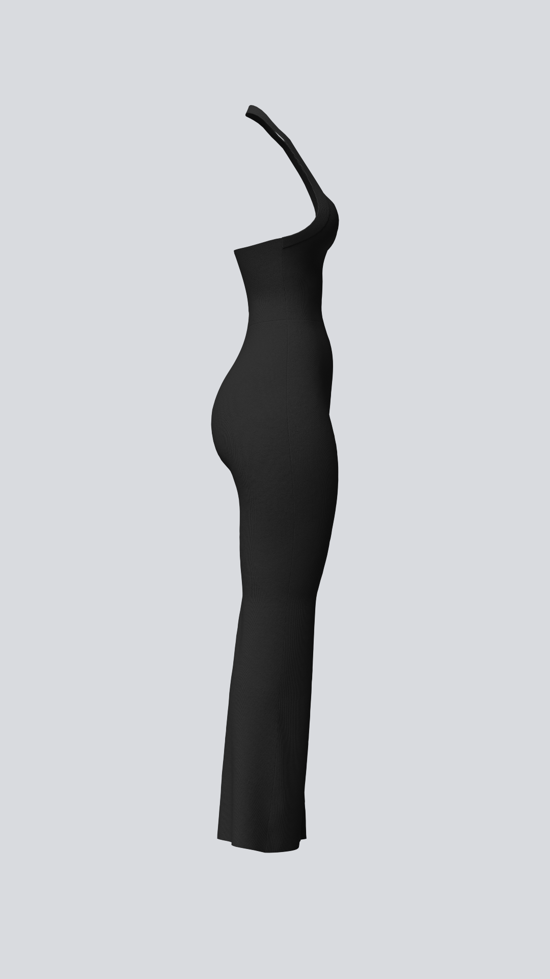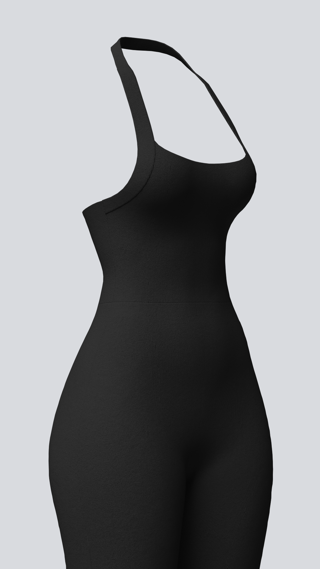 A halter neck suit with a dramatic low back and elegant flare pants. Made from our signature ribbed fabric