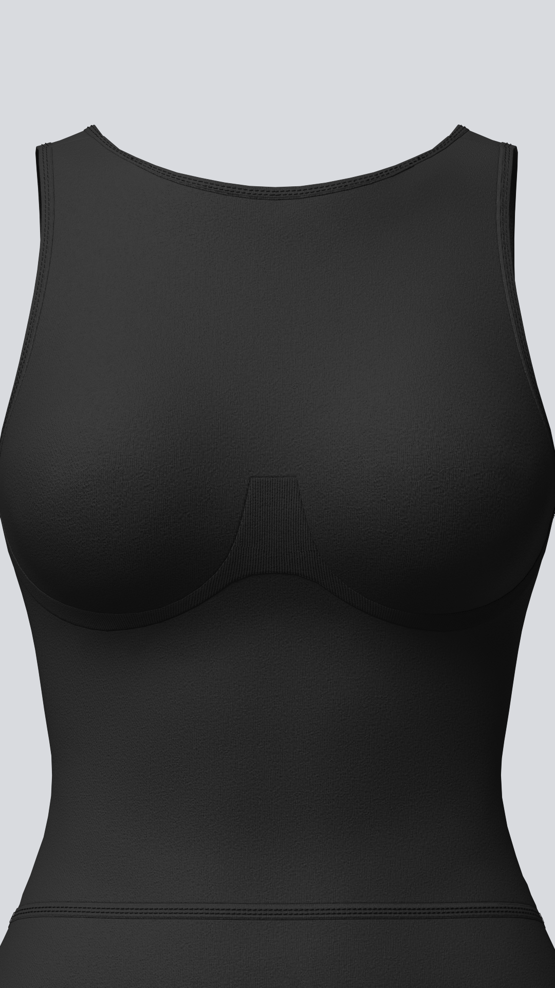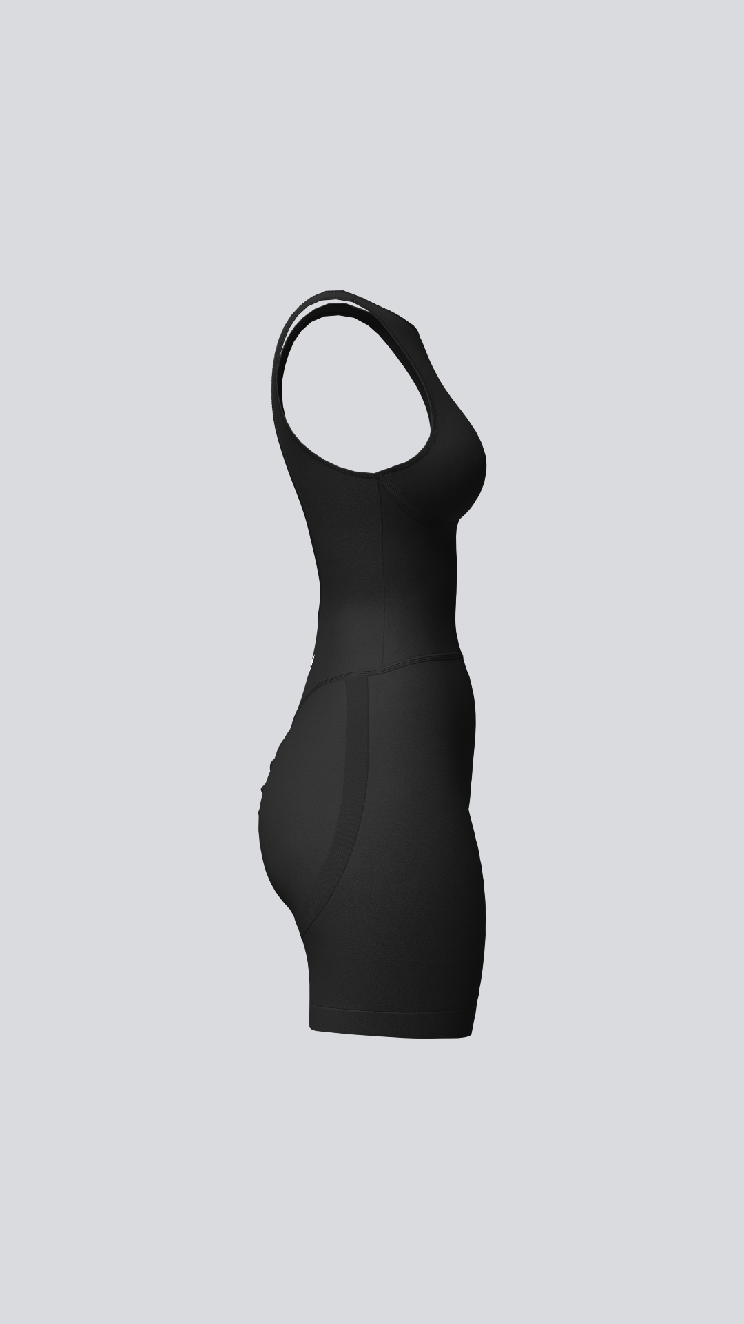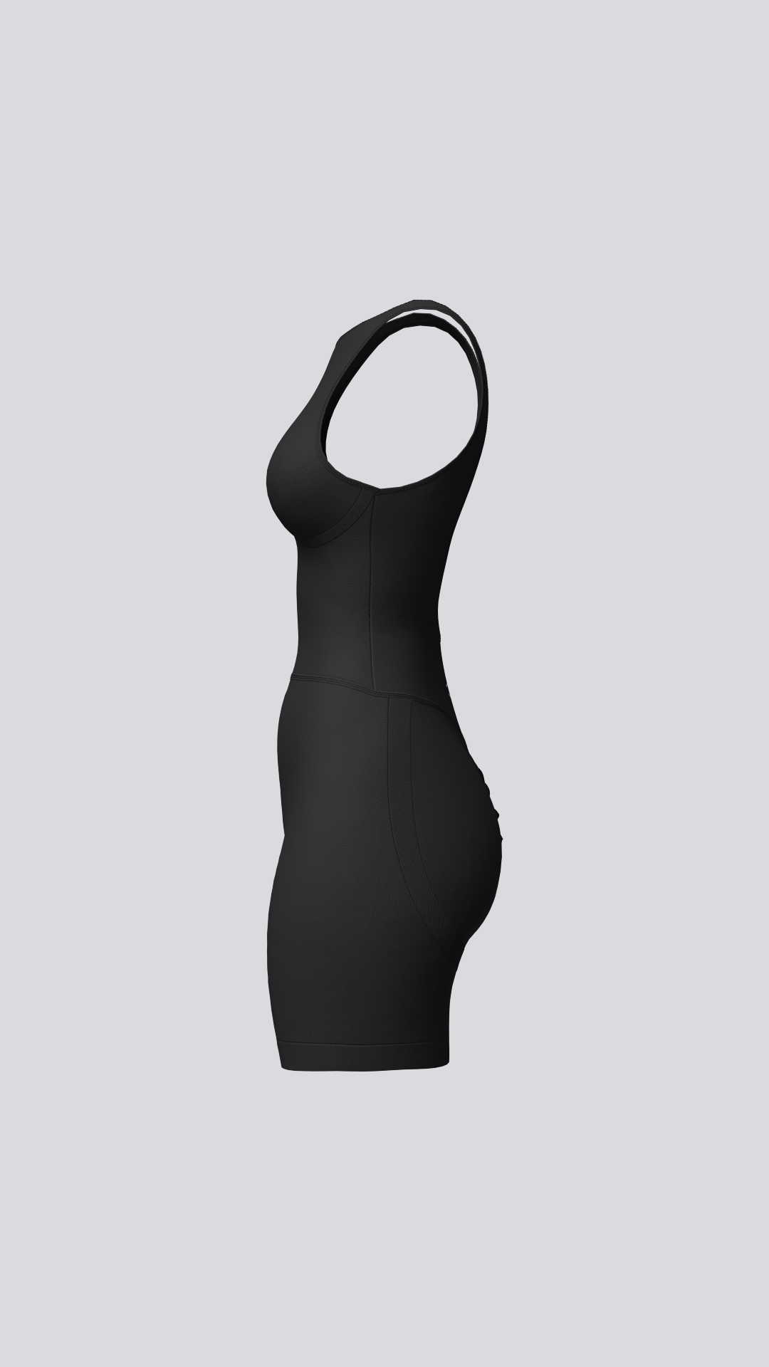 A sleek high-neck suit with a striking deep V-back and chic biker short length. Crafted from soft, stretchy fabric that hugs and contours your shape